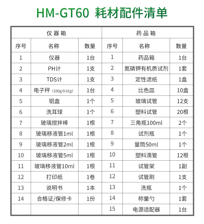 | 2 | PH計 | 1支 | 2 | 氮磷鉀有機質試劑 | 1套 |